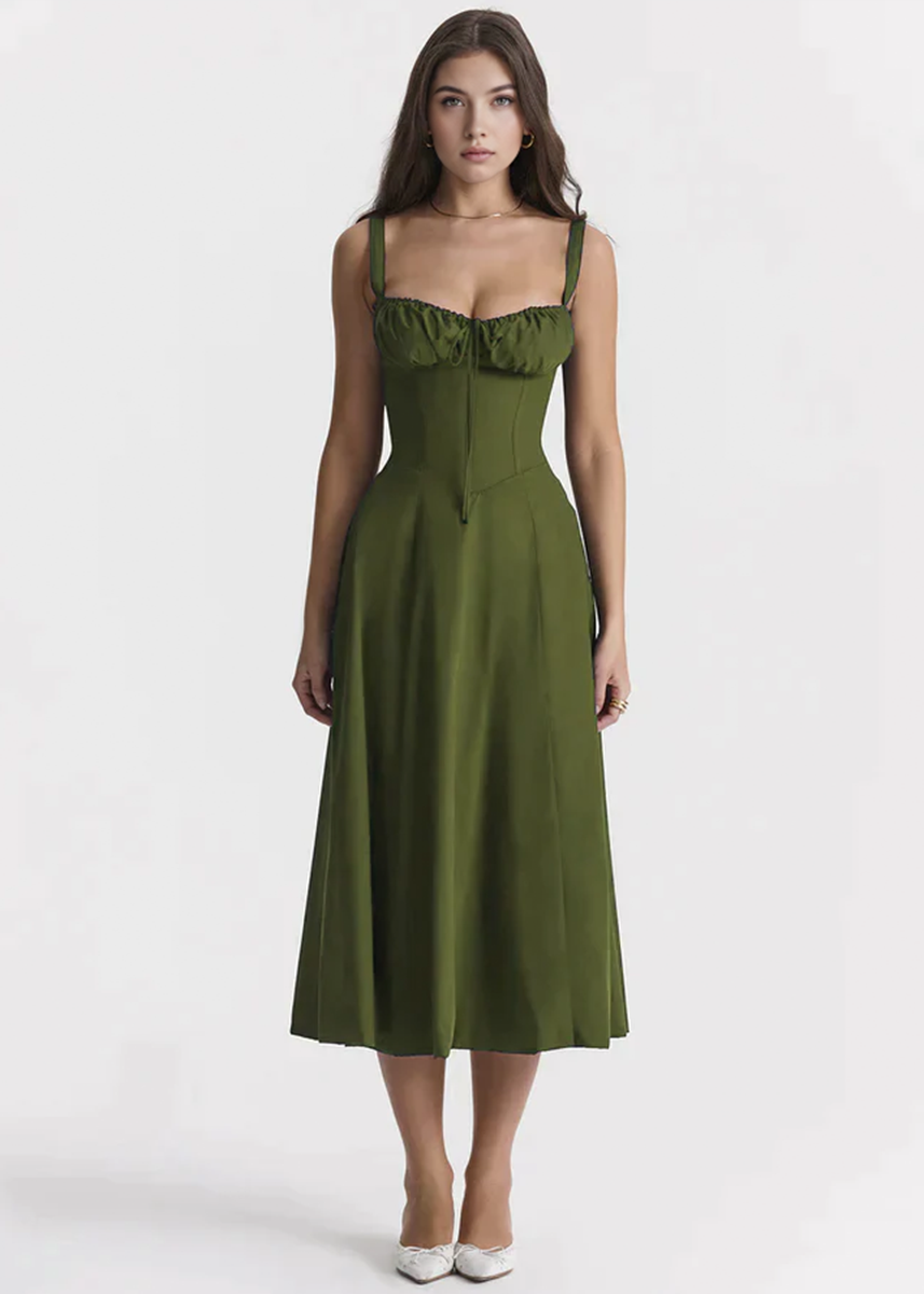 Ein feminines Midi-Kleid mit romantischem Charakter und elegantem Schnitt. Das figurbetonte Korsettoberteil mit zartem Schnürdetail betont die Taille, während der weich fallende Rock mit Schlitz für eine leichte, fließende Silhouette sorgt. Die florale Musterung verleiht dem Design eine zeitlose, sommerliche Ausstrahlung.